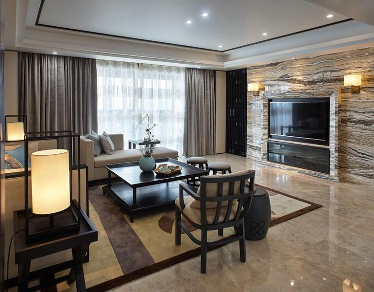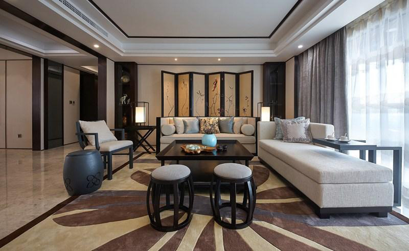中式风格的装修给人一种优雅的感觉,黑色的传统中式家具看着很大方,大理石的地板砖用其天然的质地给人一种大气的感觉。这套中式风格的住宅能给人一种明亮宽敞的感觉,主要是因为客厅内大面积的落地窗,巨大的落地窗让阳光无阻碍的照射进来,与白色的大理石地板砖相互映衬,从而让室内可以明亮通透。同时,黑色的中式风格装修家具很严谨,给人一种独特的东方风韵。