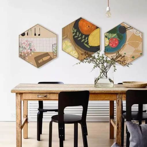 创意的六边形,温馨的暖色调,丰盛的菜品,这幅置于餐厅的装饰画光是看着都让人垂涎欲滴, 画面采用柔美的用餐风格,浓厚的生活气息,展现出了一种优雅的生活情调,选择蔬菜作为装饰画的主题,不仅能够增添用餐氛围,还能增加人的食欲。