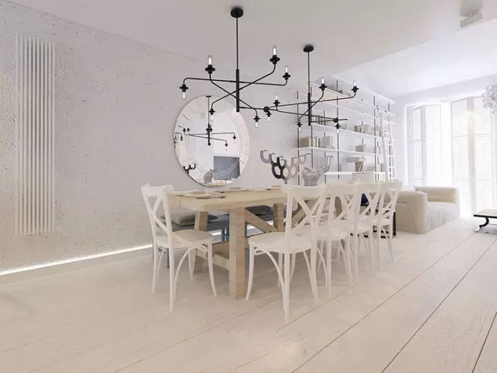 长方形的餐桌上方悬挂着两盏现代简约风格的吊灯,蜡烛形式的灯泡,造型独特,错落有致,搭配起来相得益彰。黑色铁艺灯具与白色灯泡结合,色彩分明,简单又不失美感。黑色简约风格的吊灯与餐桌椅风格十分搭配。