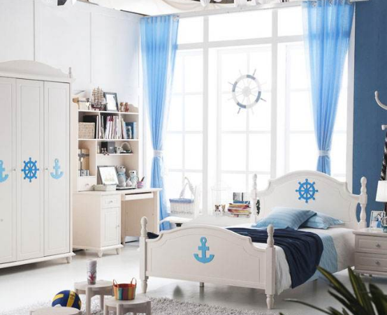 儿童房的设计不一定要运用多少不同的色彩,简单的蓝、白两色打造的地中海风格,也是很好的一种选择。