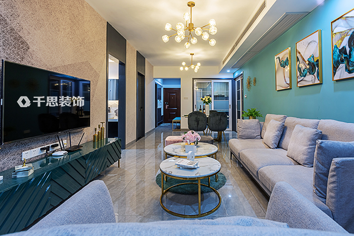 客厅,设计师采用现代优雅的灰白搭配蓝绿色的设计。