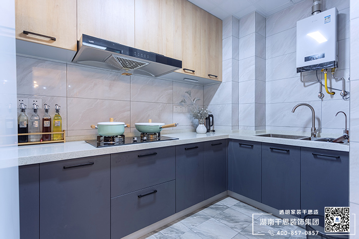 用带有大理石纹理的瓷砖妆点厨房,深海蓝色调的橱柜让空间重心偏下,木质壁柜为空间带来清爽通透的感觉。