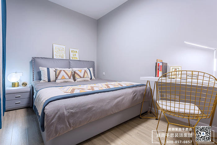 主卧由宁静的高级灰深入,金属质感的灯具作为卧室的点缀,恬静的生活气息与自然的悠然联系得更为紧密。