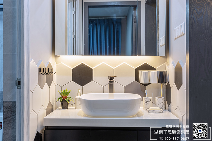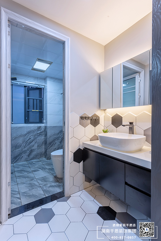 在浴室这一块小空间中,设计师精巧的运用黑白几何形砖来提升空间的时尚气质,塑造出丰富的立体构成。