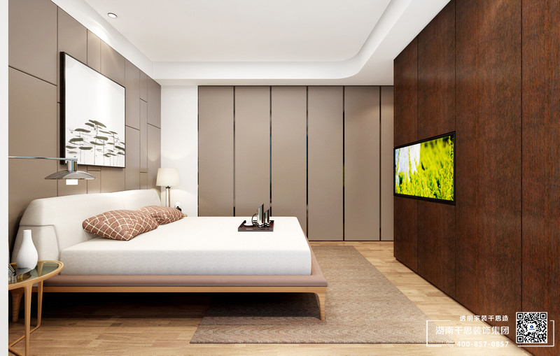 卧室以驼色的几何背景墙与矩形衣柜张扬线性之美,搭配驼色地毯,奠定了空间内的中式内蕴;褐色实木储物柜也充当了电视墙,实用却不影响空间的规整,白色床品衬托着新中式家具的轻简和大气,赋予生活更多的安静。