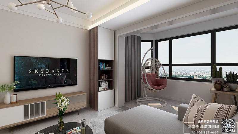 客厅整体以暖白色为整体家居的主基调,暖白相间更有家的温度,配以简约原木式面家具,简单大方,干净舒适.