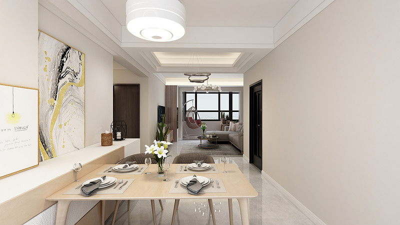 整体的空间都非常的简洁,利用吊顶的区分,给客厅与餐厅分区,用餐区跟休闲区都要不同的空间感受。