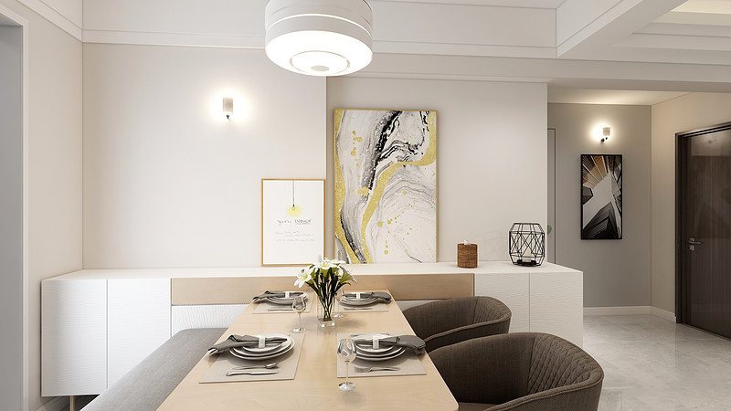 餐桌旁做了一排矮柜,日常可以存放一些物品,矮柜上放置装饰画框,显得空间饱满,墙面也不会显得很空荡。