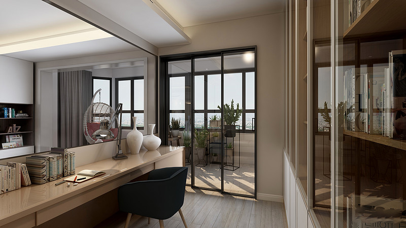 书房的设计亮点就在于打破了常规隔墙的方式,用通透的艺术玻璃在客厅沙发后单独做的书房,女主人写作时也能看到家人在客厅其乐融融的样子,光线也显得明亮,空间更加通透宽敞。