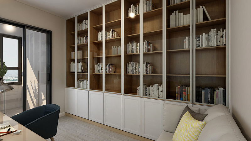 书房的背面做得是一排整体的高柜,我们的女主人是个非常热爱读书的文艺青年,这样的设计显得空间整体性更好,也能满足业主书物的储放,也可以变成一个艺术的背景墙。