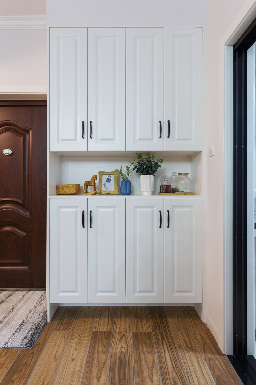 进门处铺设了黑白纹地毯,耐脏又好看。白色木质收纳柜,造型优雅简洁,与墙面融为一体,实用又不占地方!
