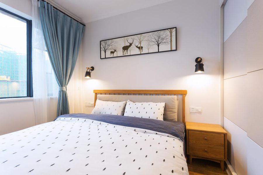 主卧面积不大,为了弱化逼仄感,卧室内的家具设计都很简洁大方,细腿木质双人床,简约同色床头柜,配上灰白双色大衣柜,再简单不过的组合,却十分耐看。