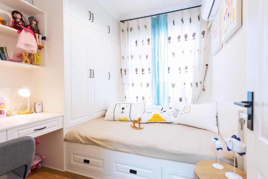 相比客卧,儿童房则更加活泼有趣。印花窗帘,动物印花抱枕,可爱的装饰画,活泼的桌面装饰,给孩子打造一个有趣放松的学习和娱乐空间。