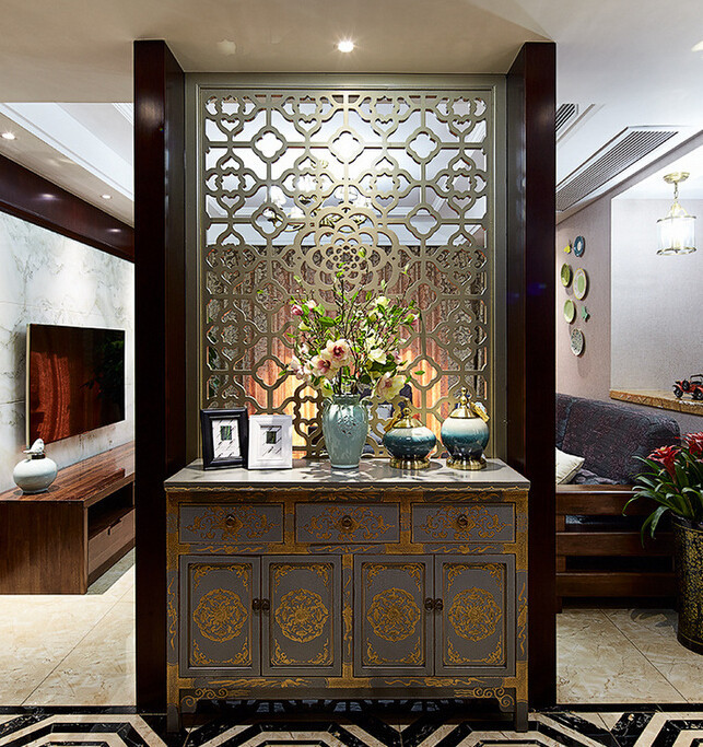 对于采光不佳的空间来说,定制的镂空柜是隔断玄关和客厅的最佳选择。不仅起到了遮挡和隔断的作用,同时自然光线可以透过板层从客厅进入玄关,弥补采光不足的缺点。
