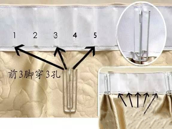 建议按照1、3、8、9穿,四齿钩的4个插脚分别插入布带上的序号1389洞眼,中间隔4个洞眼,就穿第3根叉;两个钩子之间隔6-8个洞眼。这种穿法会让窗帘的褶子看上去有点儿像蝴蝶形状。很漂亮哦!
