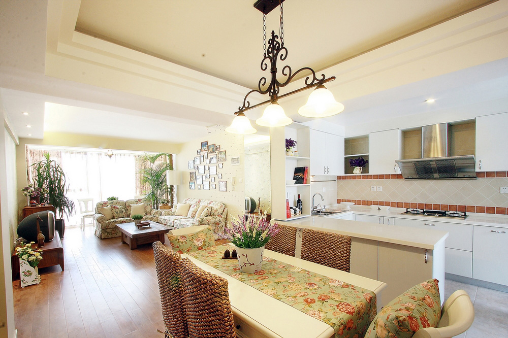 田园碎花的墙纸也成了我们客厅区的点缀,藤制+碎花布艺餐椅,餐桌上的一束花,餐边柜上花环造型的时钟,构成了我们的田园温馨美家。
