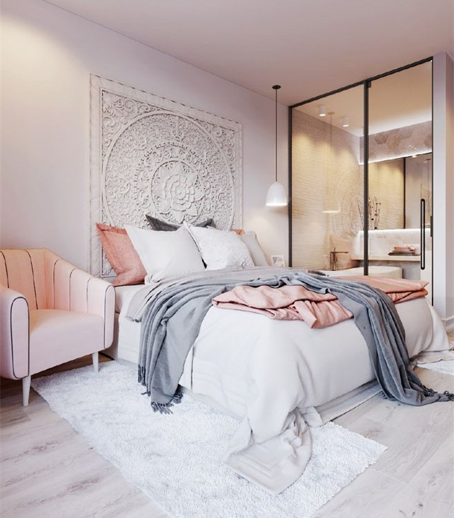 5、铺陈的布饰如地毯、台布、床罩等,应与室内地面、家具的尺寸相和谐,要保持地面和床的平衡稳定感。地面多采用稍深颜色,台布和床罩应反映出与地面的大小和色彩的对比,应以低于地面的色彩和明度的花纹,在对比中取得和谐统一。