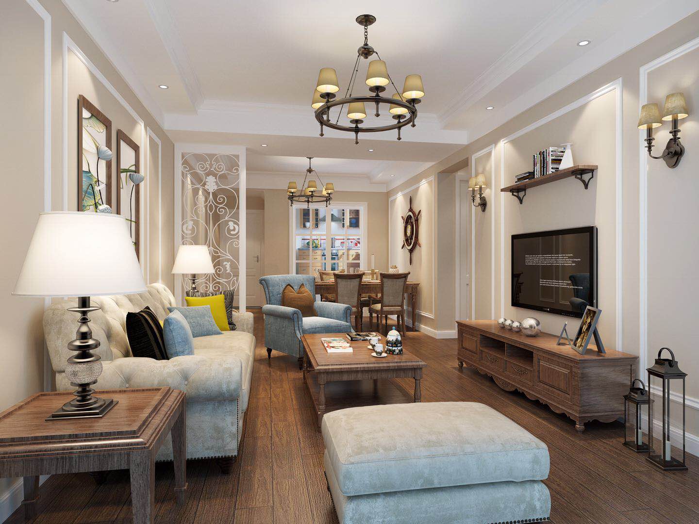 3.地面采用全房木地板的舒适感,同时跟茶几和电视机柜做个色调的协调