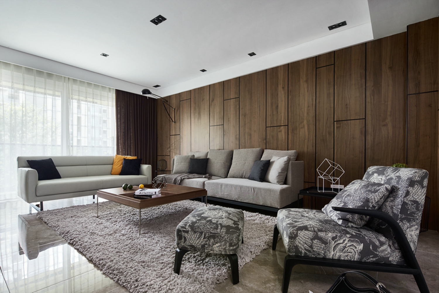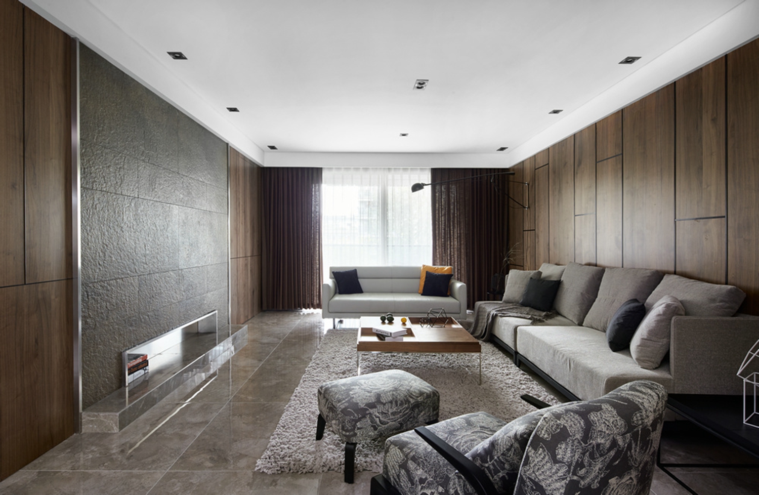 木色地板上墙,长短不一,宽度不一,使空间简约却不简单,也更有质感。