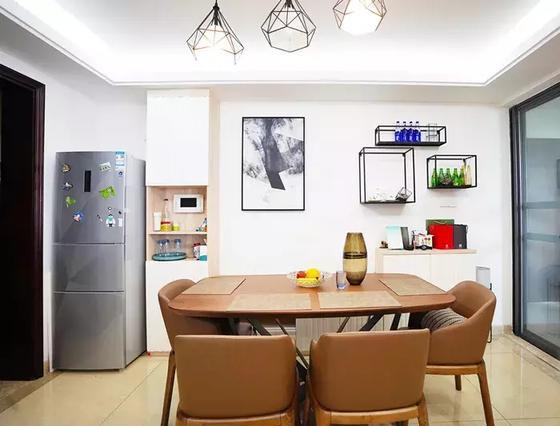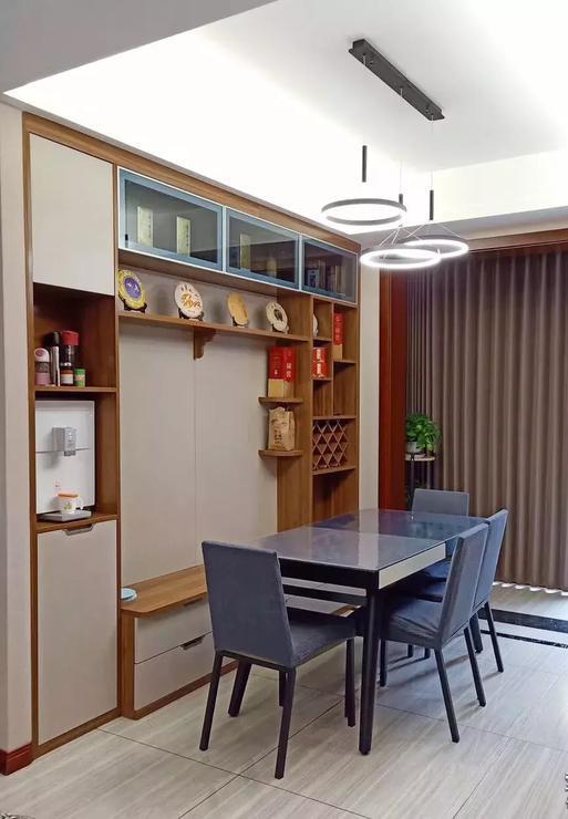 餐边柜+卡座,绕着墙贴边的设计,一面墙是卡座,一面墙是餐边柜,这样即可以收纳更多物品,而且真的可以坐很多人。