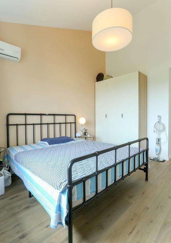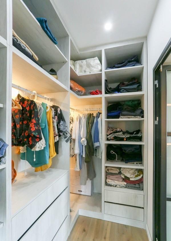 卧室左手边是一个开放式衣架,放一些平时常穿的衣物,其他的衣物都放在了卧室里的步入式衣帽间里。