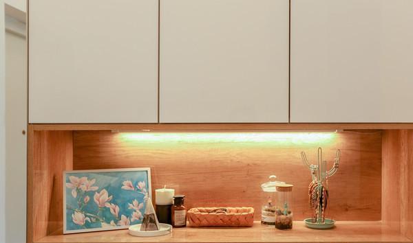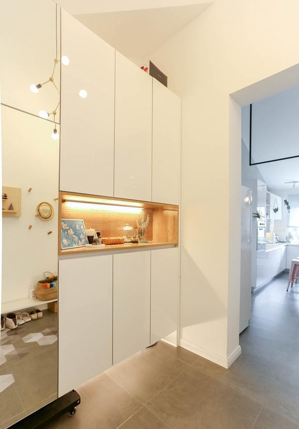 换鞋凳+定制衣柜鞋柜是玄关常见布局。不寻常的是,大王家的定制入户柜下方悬空且有感应灯,刚进家门的时候可以当做夜灯,也可以制造柜体的悬浮感,视觉上的轻量化。