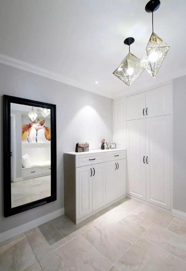 另一侧是白色的玄关柜与衣柜的组合,收纳能力极强。黑色边框的大面方形玄关镜,增强了空间的延展性与空间感。
