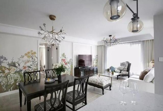 从岛台的位置看客厅和餐厅,它们的顶部各安装了一盏树枝造型的吊灯,餐桌后方墙面上的花草墙纸,清新自然。