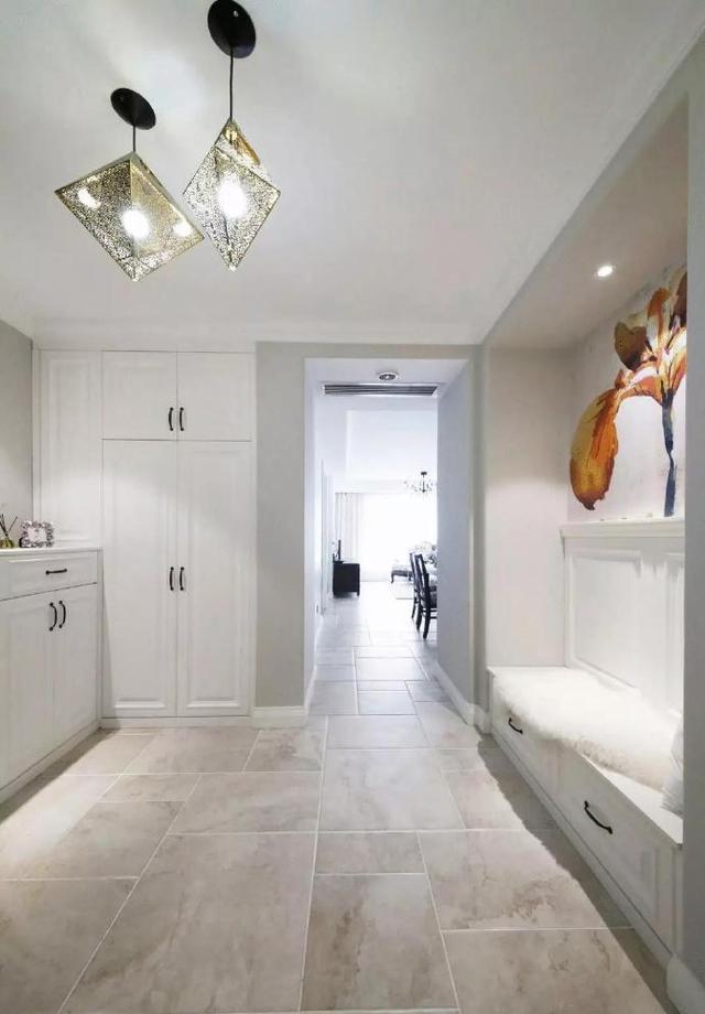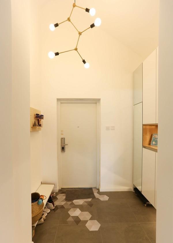 玄关处的设计个人特别喜欢,浅色的地砖与整体色调更加和谐,玄关顶部的2个菱形吊灯,造型也是很别致了。