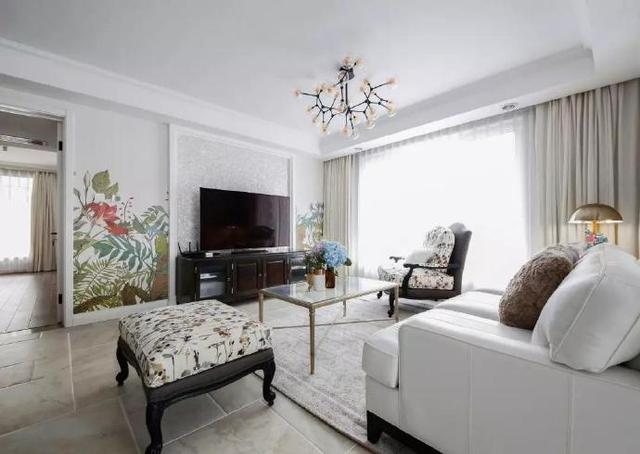 客厅的白色沙发与花色单人沙发组合,玻璃茶几简洁美观又节省了空间。铺上一块灰色的地毯格外温馨。沙发背景墙安装了一块黑色边框的磨砂玻璃窗,线条感十足。