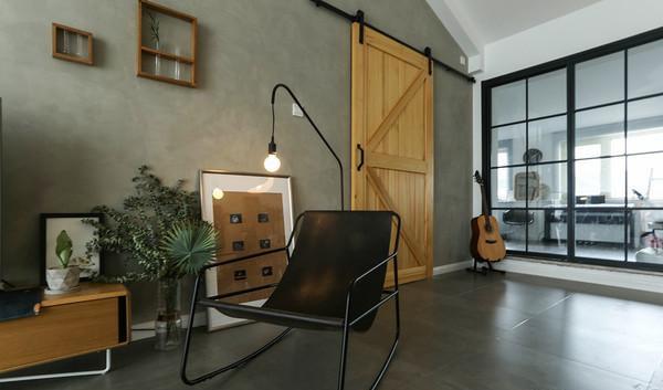 用餐区的玻璃移门,通向由露台封闭而成的休闲室。另有一侧通往客卧,特意挑选了一扇谷仓门。