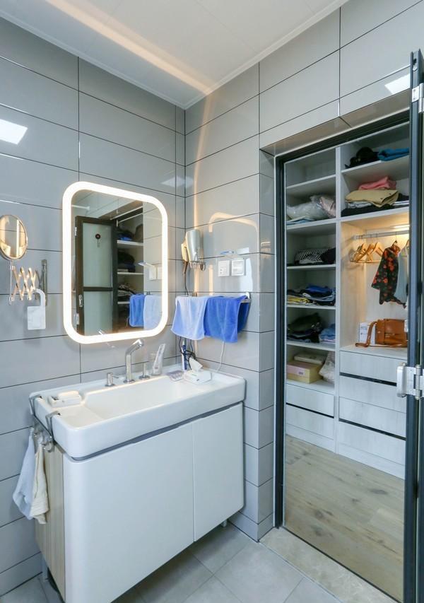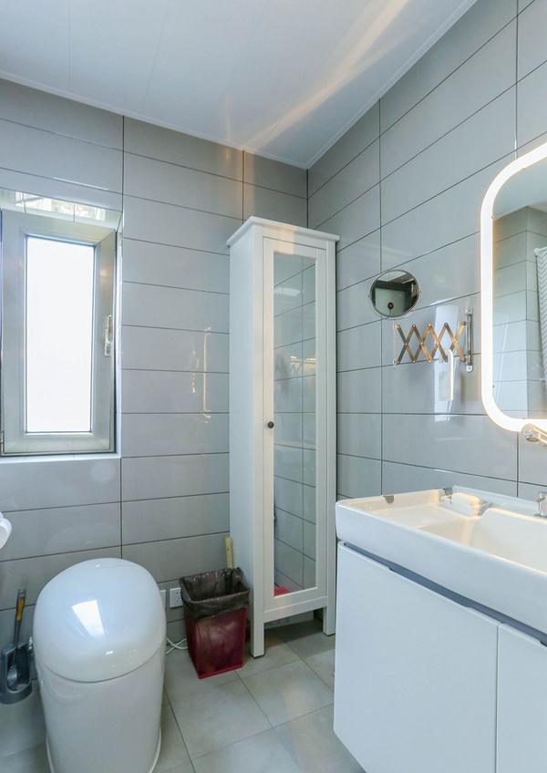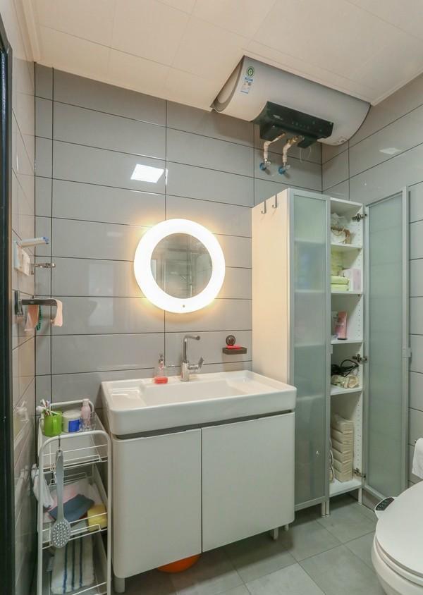卫生间一般人家是镜柜+浴室柜。大王家没有镜柜,而是LED浴室镜+带全身镜的高柜,高柜用来收纳。