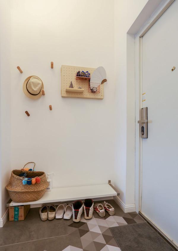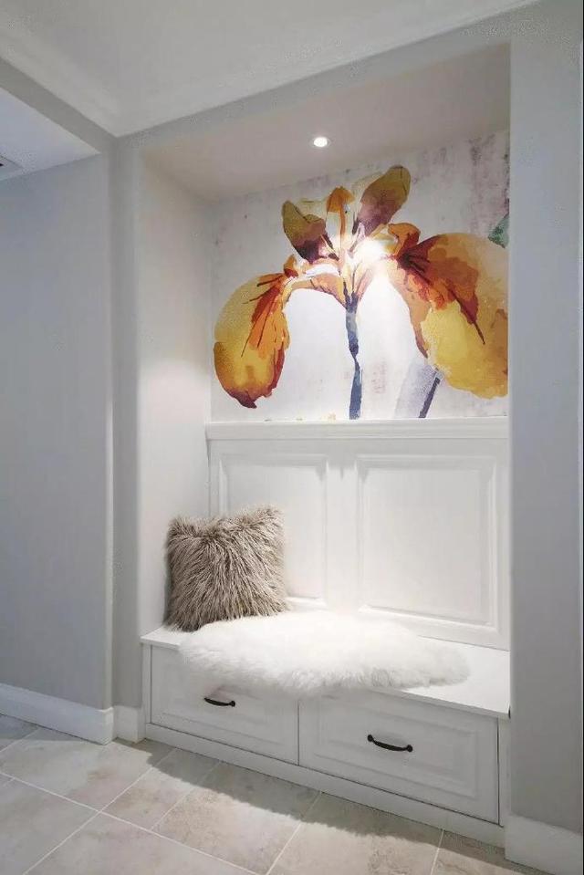 一侧是嵌入式换鞋凳的设计,白色的柜子与整体融为一体,墙面一朵黄色的花朵涂鸦点缀,点亮了整个空间。