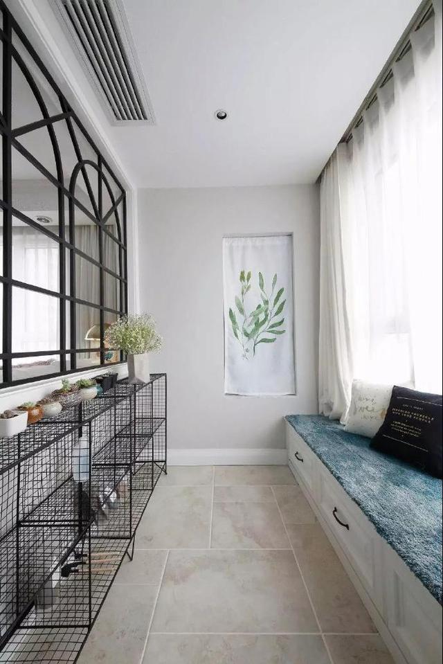 玻璃窗后面是阳台的区域,打造成一块休闲的空间,宽大的飘窗设计,铺上蓝色的飘窗垫,靠在这晒着太阳简直是一种享受。阳台的铁艺展示架也是一大亮点。
