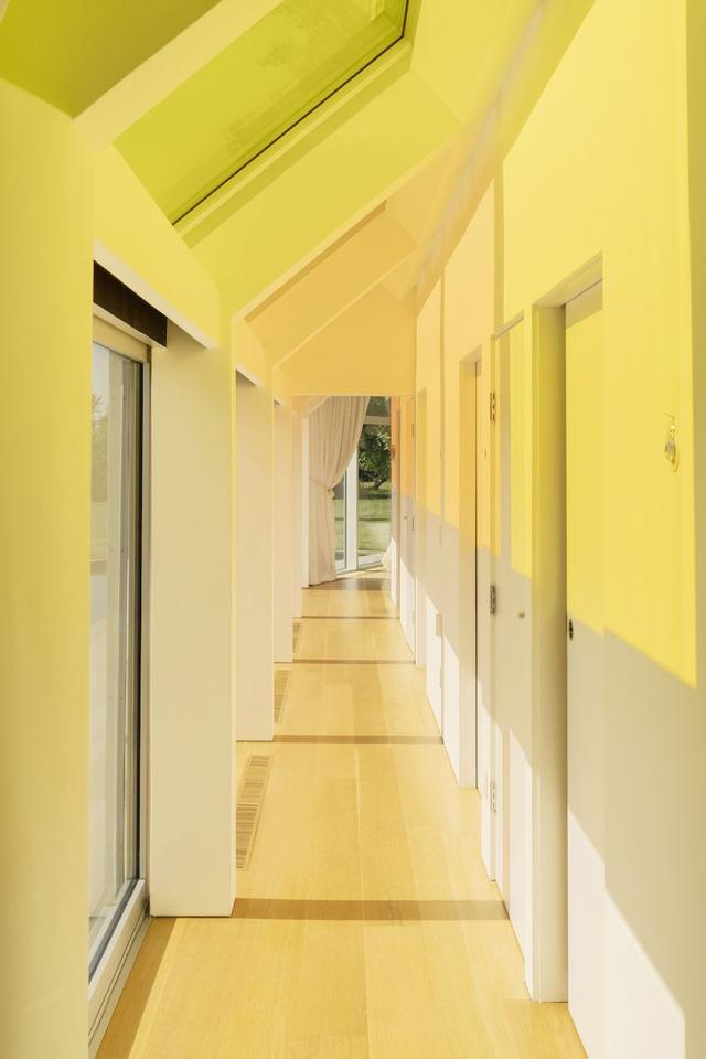 因为房子的后部是玻璃覆盖的,所以设计师增加了半透明的彩色天窗,使阳光可以穿透并在各处投射出色彩丰富,变化多端的阴影。光线也从反射池中反射出来,并通过立面反射回来。根据爱德华兹·安克(Edwards Anker)的说法,卧室走廊上排列着五颜六色的天窗是基于歌德的色彩理论,后来被19世纪画家JM威廉·特纳(JM William Turner)用在描绘水上阳光的作品中。
