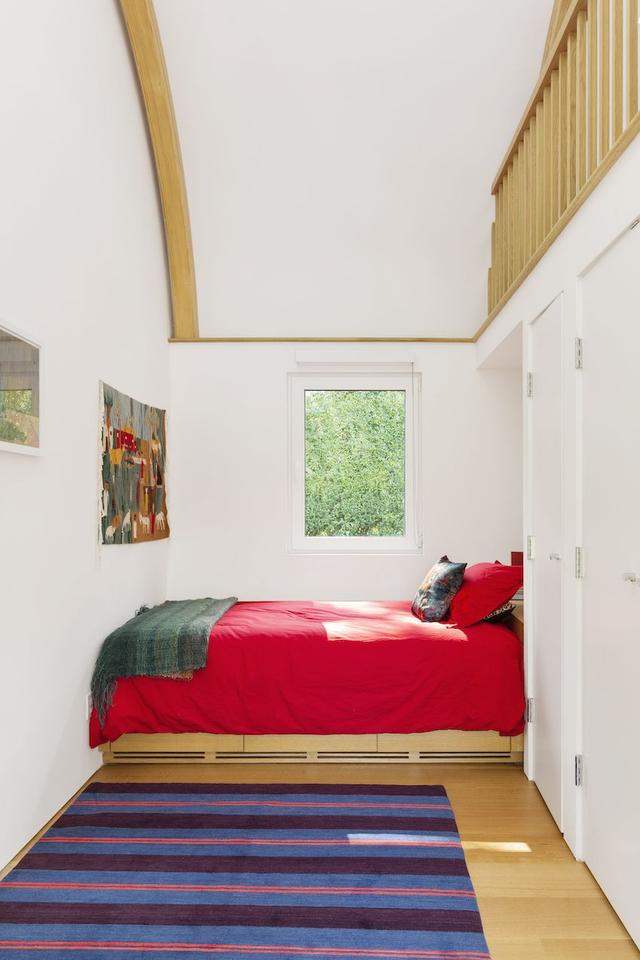 同样在卧室侧,两个额外的睡眠空间有一张床、一个封闭的储藏间和一个通往两个房间之间的阁楼空间的梯子。床上用品的颜色与天窗的色调相呼应,将整个配色方案组合在一起。