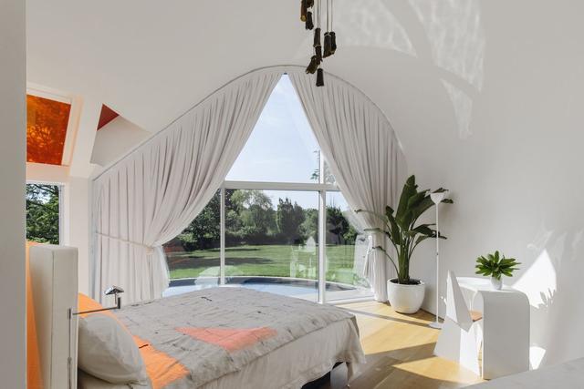在主卧室位于卧室翼的端部,并设有通过大的,弯曲的窗口横跨后院壮观图。在左侧,可以看到彩色的天窗,也可以看到它们投射在床上的几何阴影。由于房间和窗户的形状不同寻常,所以装饰干净整洁,并且很少将注意力集中在视图上。