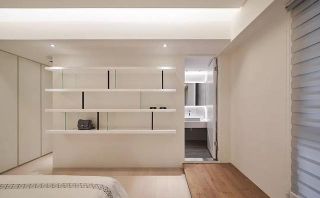 客厅廊道直通的便是这个房间。这样一来,整体装修的联动性更强,不像被隔开的一个个小空间,更像是一个整体。瓦楞玻璃的运用很容易就有高级感。
