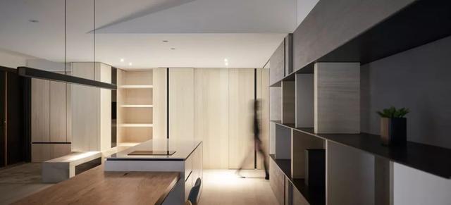 这套设计中玄关柜顶天立地,一直延伸到厨房。收纳满分的同时,柜体和墙面一体化,视觉上更加通透。利用试鞋凳做隔断,不挡光线,一目了然,美观实用两不误!