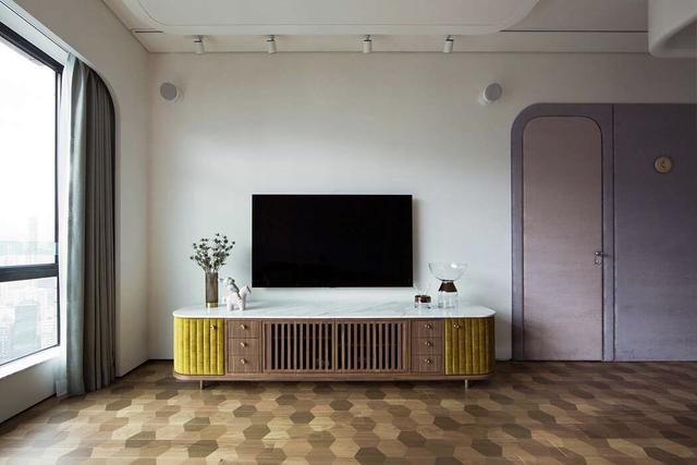 电视柜为了更贴合空间调性,选择了有竖条装饰的款式,与墙面的圆角矩形、地面的六边形图案的木地板相互呼应。撞色设计,给空间增添一抹活力。