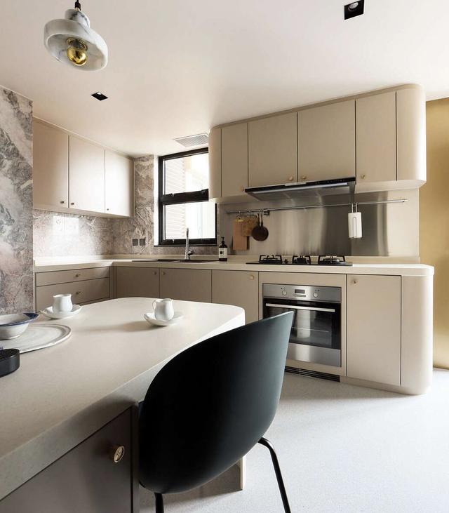 顺着墙体动线,安装定制橱柜,增大收纳空间,将那些瓶瓶罐罐的调料、锅碗瓢盆都藏起来,保持空间整洁。