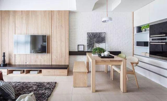 ▲若是想要提升设计感,可以考虑用两种不同的材质来做出拼接的视觉效果,如这个案例中,客厅墙面使用的是木质材料,与餐厅的墙面质感完全不同,很好的区分了两个空间。