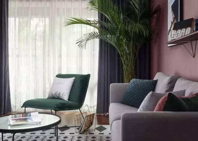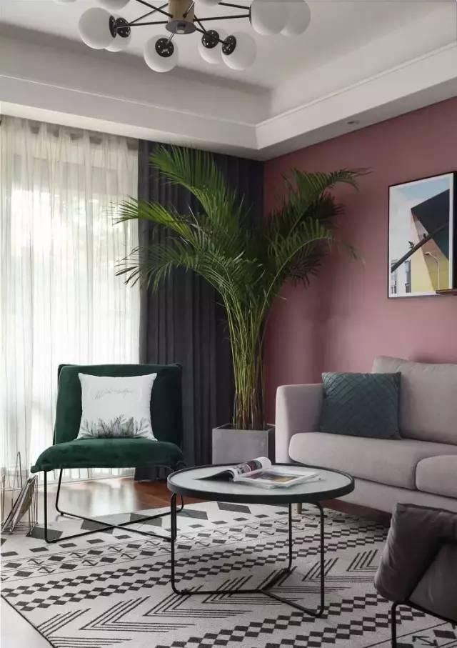 地毯采用了灰白色几何图案,增强了空间层次感。沙发背景墙采用了烟粉色,适应目前的流行趋势,有一种高级感。搭配简约的布艺沙发,充满格调。