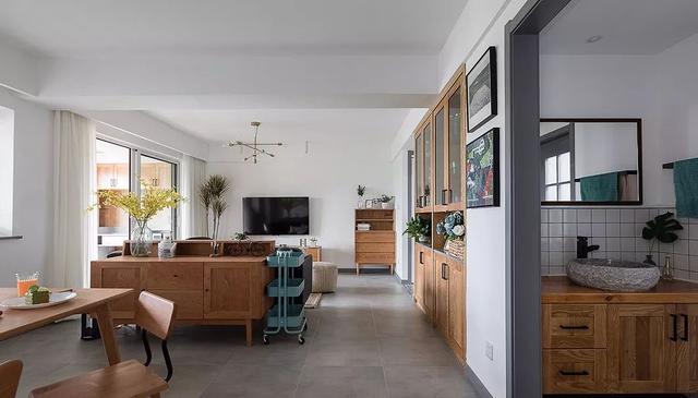 ▲ 卫生间采用干湿分离的设计,干区台盆柜的柜体是木工现场打的,台面用的是一整块的实木,墙砖贴半腰高就好,层次感更强。