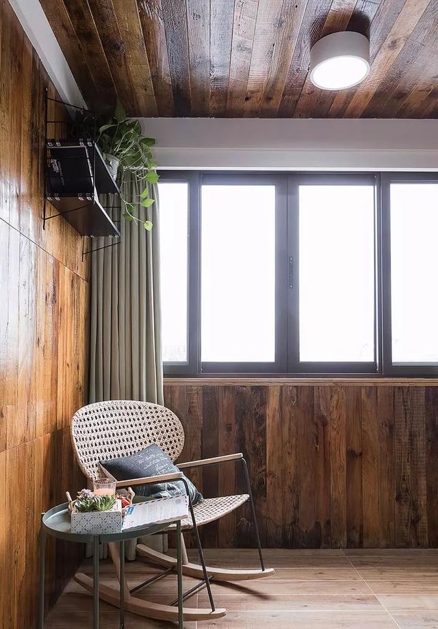 ▲ 阳台的墙面用的都是老松木,闲暇时可以躺在摇椅上吃点水果、看看书,不失为一种享受。