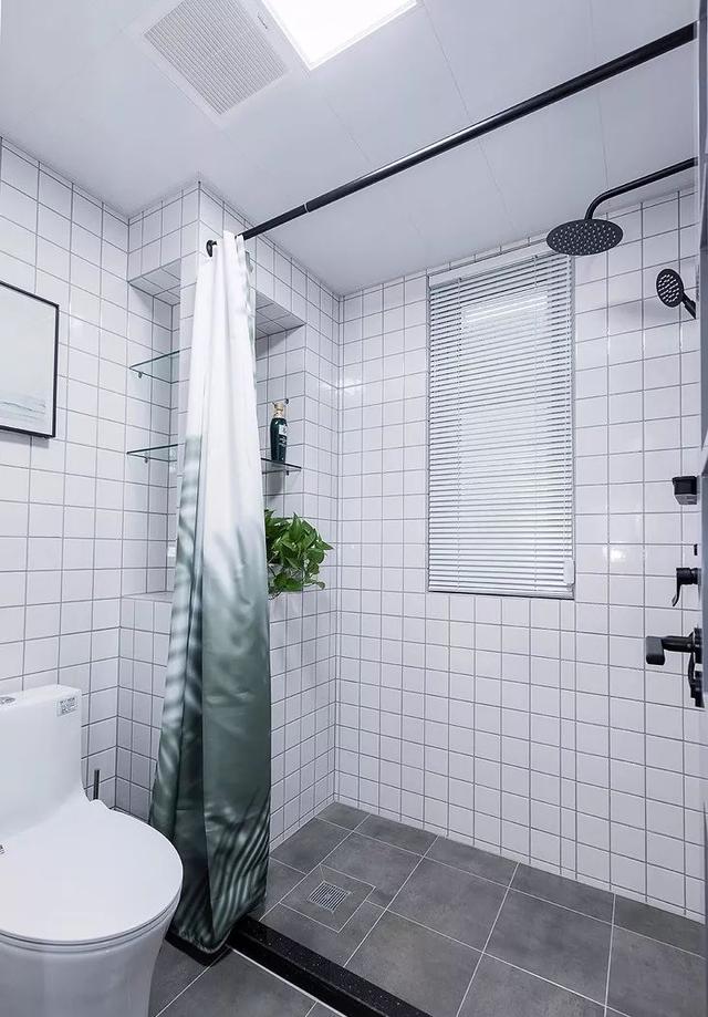▲ 湿区干净清爽,墙面用的是白色九宫格瓷砖,利用下水管的地方,做了两个壁龛,用来放置洗漱用品,省去了一些五金挂件。