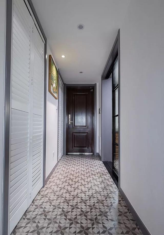▲ 走廊左侧是两个储藏间,都采用的是百叶折叠门。地面铺设了小花砖,精致又好看。