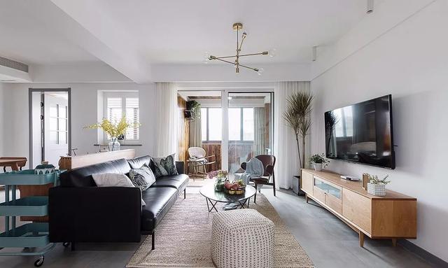 ▲ 通透、简洁的客厅,没有做过多的复杂设计,而是将小巧思集中在软装方面。宽大的灰色皮质沙发质感满满,同色系的抱枕点缀其上,丰富了空间层次感,让人不由得想深陷其中。
