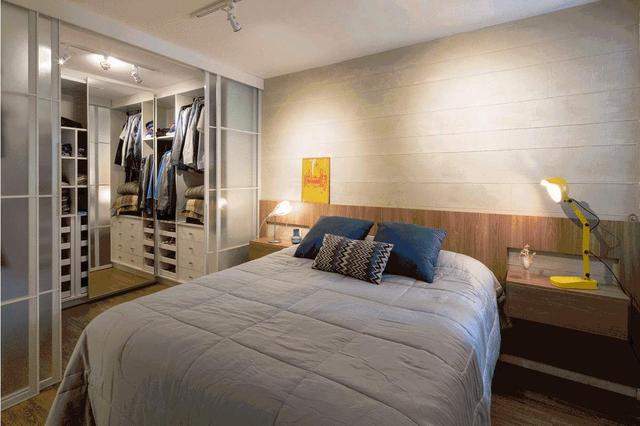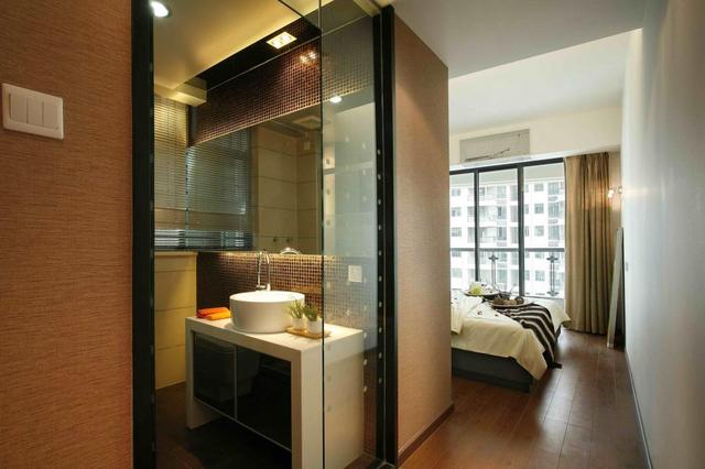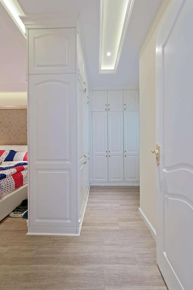 如果还想要卫生间的功能,也可以只把卫生间里的门口部分改成衣帽间。这样卫生间里的噪音和空气有了衣帽间的缓冲,对床的影响也能降低不少。不过这种做法不能放在暗卫,否则衣物就成了湿气和异味的吸收剂了。