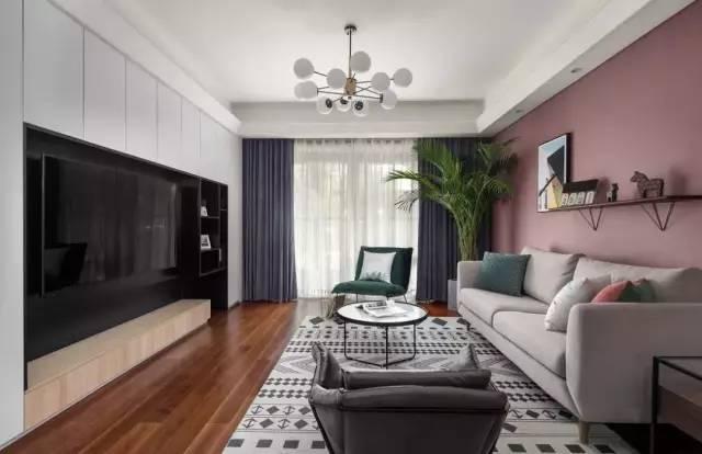 地毯采用了灰白色几何图案,增强了空间层次感。沙发背景墙采用了烟粉色,适应目前的流行趋势,有一种高级感。搭配简约的布艺沙发,充满格调。